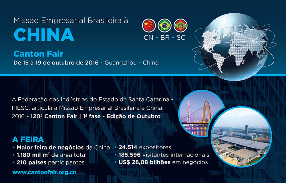Florianópolis, 29.8.2016 – A Federação das Indústrias de Santa Catarina (FIESC) está com inscrições abertas para a missão empresarial brasileira à China, que será realizada de 12 a 19 de outubro, para participar da feira de Cantão, o maior evento de negócios do País, realizado em Guangzhou. Também estão previstas visitas técnicas a empresas e instituições na cidade. Clique aqui e veja a programação completa. Informações adicionais pelo telefone 48 3231-4662.