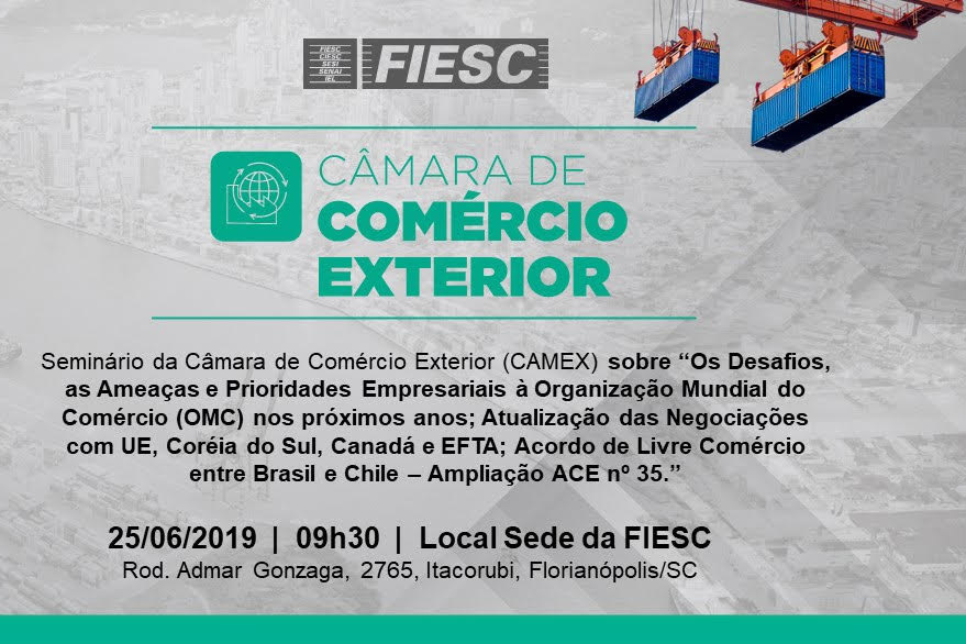 Florianópolis, 12.6.2019 – Os desafios, ameaças e prioridades empresariais na Organização Mundial do Comércio (OMC) nos próximos anos serão tema de seminário promovido pela Câmara de Comércio Exterior da FIESC. No encontro, marcado para o dia 25 de junho, às 9h30, na sede da entidade, em Florianópolis, também serão abordados o andamento das negociações comerciais com a União Europeia, Coreia do Sul, Canadá, Associação Europeia de Livre Comércio (EFTA), além do acordo de livre comércio entre Brasil e Chile. Os assuntos serão abordados pelo gerente de negociações internacionais da CNI, Fabrizio Panzini.