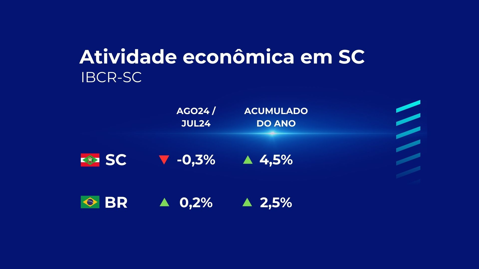 Florianópolis, 22.10.2024 - A atividade econômica de Santa Catarina apresentou queda de 0,3% em agosto, na comparação com o mês anterior, de acordo com o Índice de Atividade Econômica Regional (IBCR-SC). Apesar do recuo, o estado manteve um desempenho positivo no acumulado do ano, com crescimento de 4,5% em relação ao mesmo período de 2023. O resultado do ano ficou acima da média nacional para o período, que foi de 2,5%.