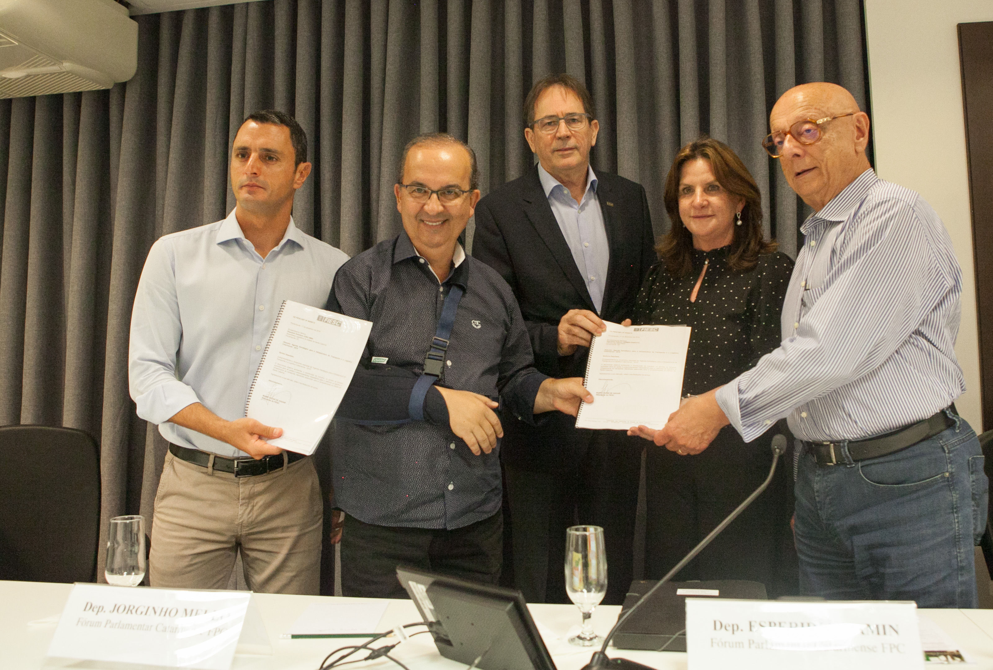 O presidente da FIESC salientou ainda que existe uma classificação de serviço norte-americana que vai de A até F, sendo A o melhor serviço e F o pior. “Na nossa rodovia BR-101, em vários trechos e horários a classificação é F. O estado está se litoralizando e nossos portos são uma plataforma logística para o Brasil, com a movimentação de cerca de 20% dos contêineres do país. Então, há que se discutir o Contorno da Grande Florianópolis e a BR-101 como um todo”, propôs. Aguiar também entregou a representantes do Fórum Parlamentar Catarinense a Agenda da Indústria para Infraestrutura, documento que mostra que Santa Catarina demanda R$ 3,9 bilhões por ano para manter e ampliar a infraestrutura de transporte nos modais rodoviário (R$ 2,85 bilhões), ferroviário (R$ 626 milhões), aeroviário (R$ 61,1 milhões) e aquaviário (R$ 342,6 milhões). “A FIESC tem uma preocupação forte com relação à infraestrutura, que afeta o desenvolvimento nossa indústria e do nosso estado. Temos uma pesquisa que nos mostra que o componente transporte tem uma participação importante na composição do custo das empresas. Fazer melhorias na infraestrutura de transporte fazer melhoria na infraestrutura de transporte é tornar Santa Catarina mais competitiva”, completou.