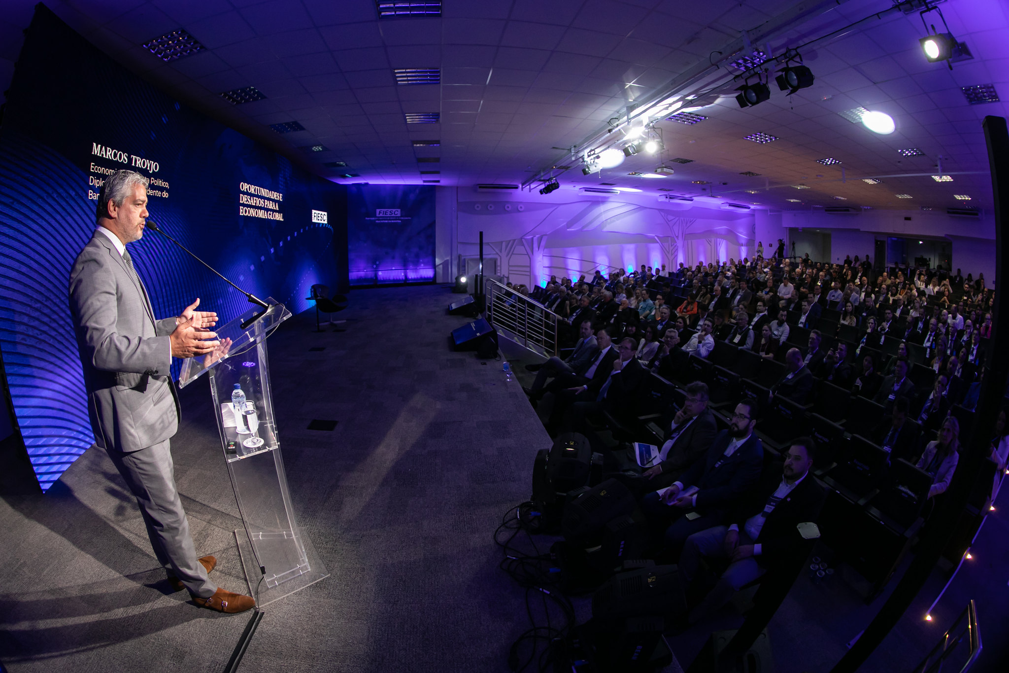 Florianópolis, 18.8.2023 - “O agronegócios é extraordinariamente importante e o Brasil não se desenvolverá sem ele, mas também não se desenvolverá apenas com ele porque terá que agregar valor em diferentes setores”, afirmou o ex-presidente do Banco do Brics, Marcos Troyjo. Ele ministrou palestra na Federação das Indústrias (FIESC), nesta sexta-feira, dia 18, a uma plateia de lideranças industriais e políticas, em que explicou como o aumento da população mundial para 10 bilhões de habitantes em 25 anos e o reposicionamento das cadeias globais de valor abrem oportunidades para países como Brasil, México e Índia.