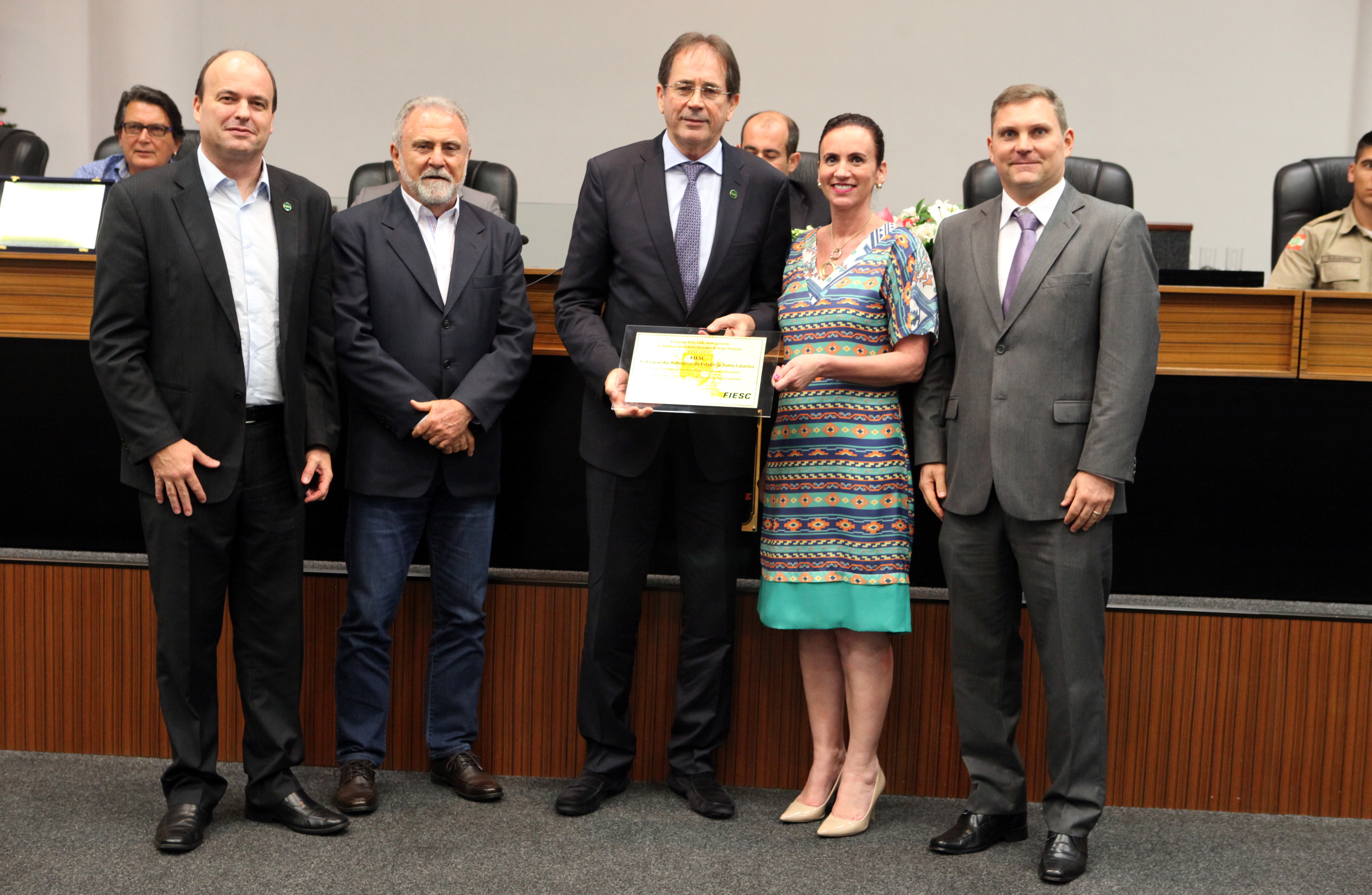 Joinville, 15,12.2016 - A Federação das Indústrias de Santa Catarina (FIESC) recebeu homenagem da Câmara de Vereadores de Joinville pelos 65 anos de fundação, em Sessão Solene realizada na noite desta quarta-feira, dia 14. Mario Cezar de Aguiar, 1º vice-presidente, representando a FIESC, destacou o orgulho de receber a homenagem. “O evento desta noite é uma oportunidade para relembrar um pouco da história da Federação das Indústrias, fundada em 25 de maio de 1950 por sete sindicatos de empregadores. Mas é também momento para mostrar como a instituição cresceu junto com a indústria catarinense e hoje tem papel decisivo para a competitividade do setor”, pontuou.