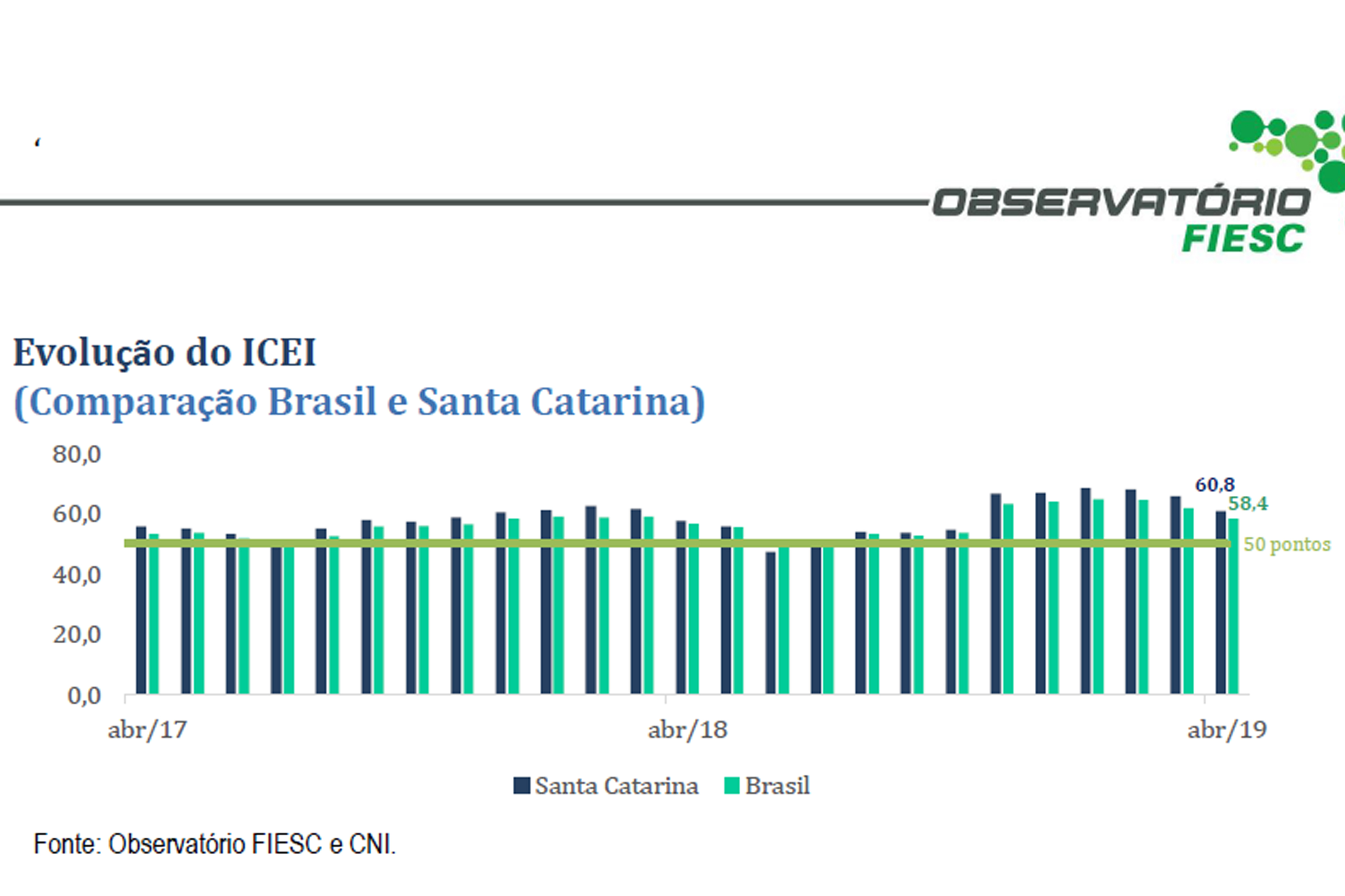 Florianópolis, 22.4.2019 – O Índice de Confiança do Empresário Industrial (ICEI) de Santa Catarina passou de 65,7 pontos em março para 60,8 pontos em abril. É a terceira queda consecutiva em 2019, informa pesquisa da FIESC, divulgada nesta segunda-feira (22). Os indicadores variam de zero a cem pontos. Quanto mais acima dos 50 pontos, maior é a confiança dos empresários. O índice catarinense permanece otimista, mas esta é uma das maiores quedas já registradas na série histórica, iniciada 2010. Veja aqui os dados completos