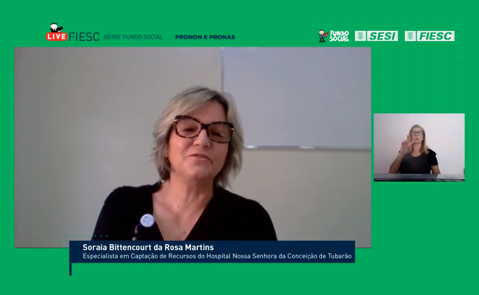Florianópolis, 29.10.2020 – Nesta quinta-feira, 29, a especialista em captação de recursos do Hospital Nossa Senhora da Conceição (HNSC), de Tubarão, Soraia Bittencourt da Rosa Martins, foi a convidada da penúltima live da série que o Fundo Social da FIESC promove para capacitar empresas e o terceiro setor sobre os mecanismos de incentivos fiscais. O encontro virtual foi transmitido pelo canal do SESI/SC no YouTube e elucidou principalmente como funcionam os programas nacionais de Apoio à Atenção Oncológica (Pronon) e de Apoio à Atenção da Saúde da Pessoa com Deficiência (Pronas).