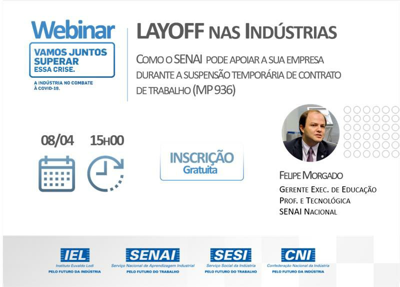 Florianópolis, 8.04.2020 - O SENAI realiza nesta quarta-feira, às 15h, seminário online sobre a suspensão temporária do contrato de trabalho, prevista na MP Trabalhista 936. O gerente executivo de educação profissional e tecnológica do SENAI Nacional, Felipe Morgado, fala sobre como a entidade pode apoiar a indústria neste processo. Inscreva-se aqui.