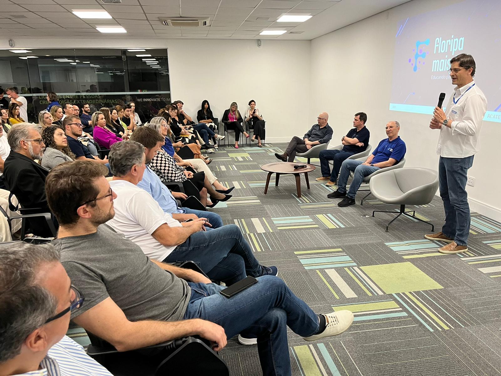 Florianópolis, 22.09.2023 - Nesta quinta-feira (21), empresas do setor de tecnologia da Grande Florianópolis conheceram mais detalhes sobre o Floripa Mais Tec - programa de ensino tecnológico que visa à qualificação de novos profissionais para a área de TI. O evento reuniu mais de 100 participantes, lotando o auditório do Centro de Inovação ACATE Primavera (CIA Primavera), em Florianópolis.