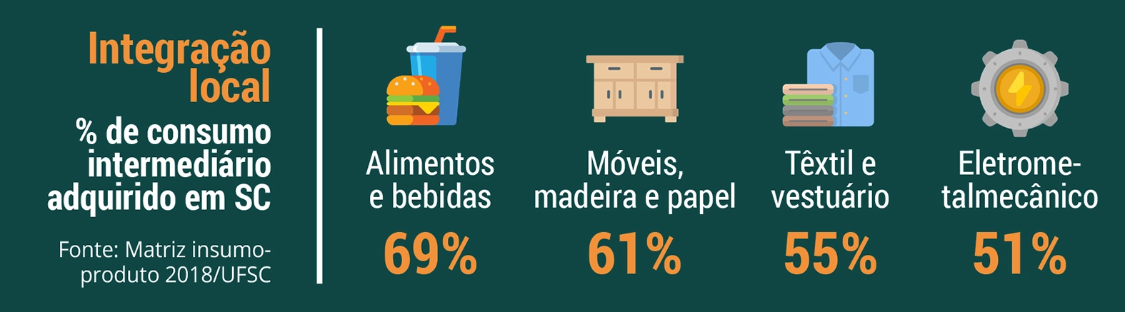 Apesar do sucesso de indústrias em cadeias produtivas complexas, o enraizamento produtivo em Santa Catarina é observado mais frequentemente em setores tradicionais e de baixa intensidade tecnológica, como alimentos, madeira e móveis e têxtil e confecções, de acordo com o artigo acadêmico que analisa a matriz insumo-produto da indústria. São setores intensivos em recursos naturais e em mão de obra, instalados há muitas décadas no Estado, ao passo que setores mais intensivos em tecnologia não possuem ainda adensamento tão forte.
