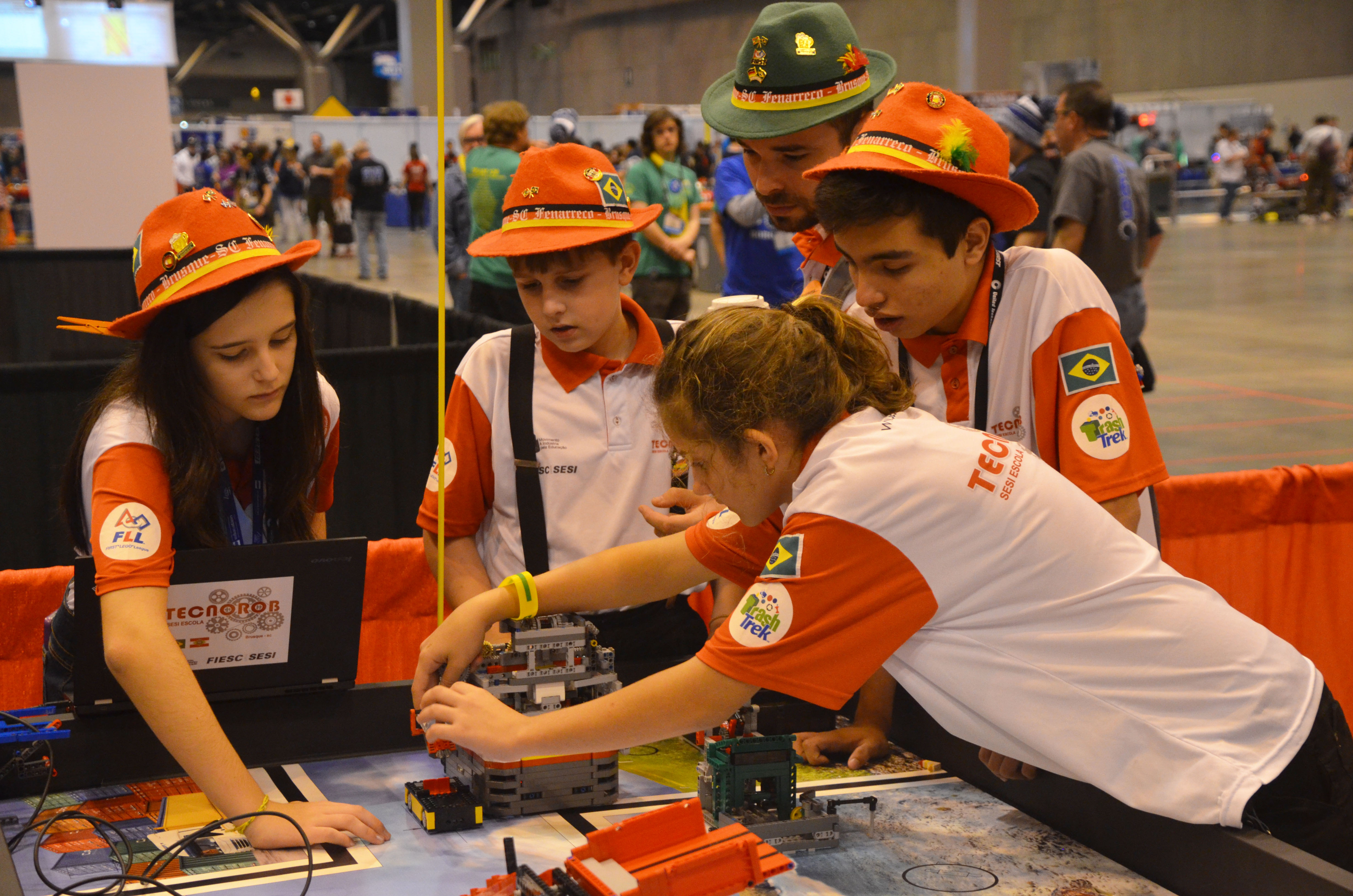 Florianópolis, 2.5.2016 – Os dez estudantes catarinenses do SESI Escola em Brusque, uma entidade da FIESC, que participaram de 28 a 30 de abril do torneio internacional de robótica First Lego League (FLL), nos Estados Unidos, conquistaram resultados importantes para o Brasil. Eles desenvolveram um dos robôs com melhor desempenho da competição (18º), dentre 106 equipes. O grupo de Santa Catarina foi o melhor colocado entre os três times brasileiros que competiram (dois de São Paulo e um do Paraná). O resultado é inédito para o SESI/SC.