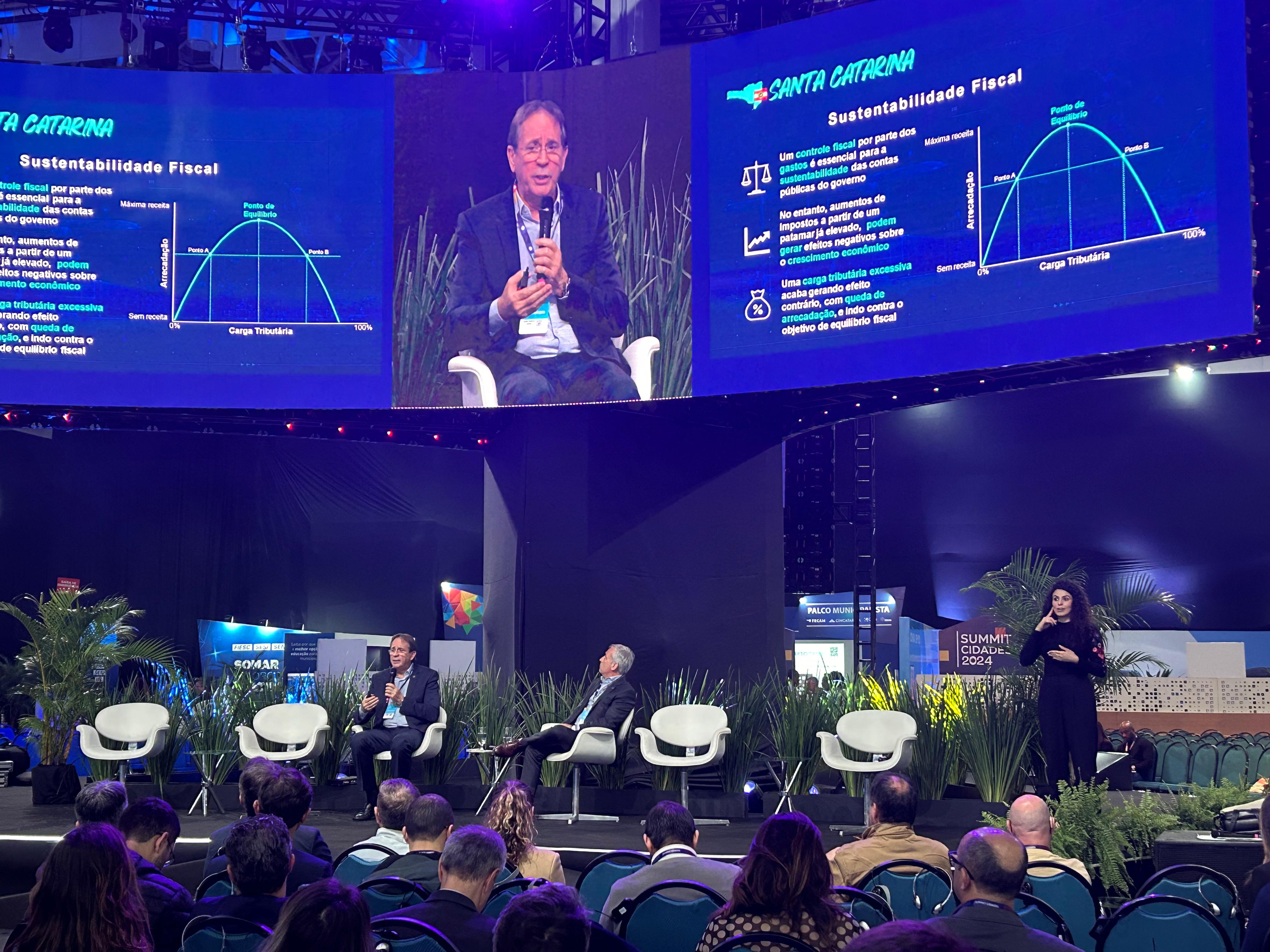 Florianópolis, 25.06.24 - No SUMMIT Cidades, o presidente da Federação das Indústrias (FIESC), Mario Cezar de Aguiar, apresentou o potencial da economia catarinense para atrair investimentos e gerar negócios. Ele ministrou palestra no evento, que ocorre em Florianópolis, de 24 a 26 de junho. O estande da FIESC e suas entidades (SESI, SENAI e IEL) no evento apresenta soluções nas áreas de educação, saúde e inteligência de dados. Profissionais da FIESC também participaram de painéis que debateram temas como: empreendedorismo, contraturno escolar, descarbonização e saúde.