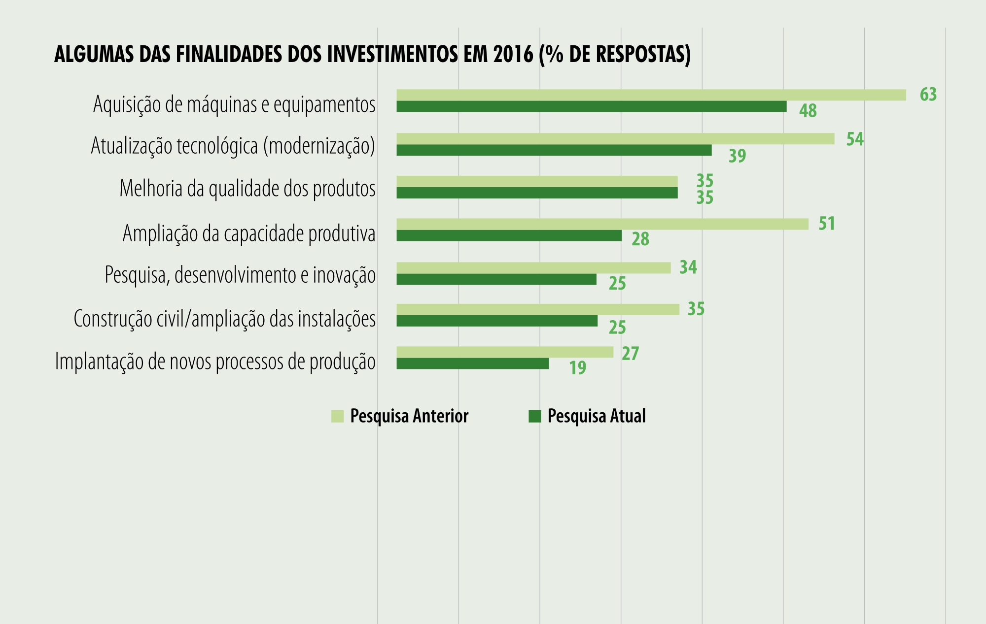 A conjuntura afetou o perfil dos investimentos, mostrando que os industriais estão buscando ajustar as operações de suas empresas melhorando a gestão. Houve redução nos percentuais das empresas que pretendem adquirir máquinas e equipamentos (de 63% para 48%), realizar atualização tecnológica (de 54% para 39%) e ampliar a capacidade produtiva (de 51% para 28%).