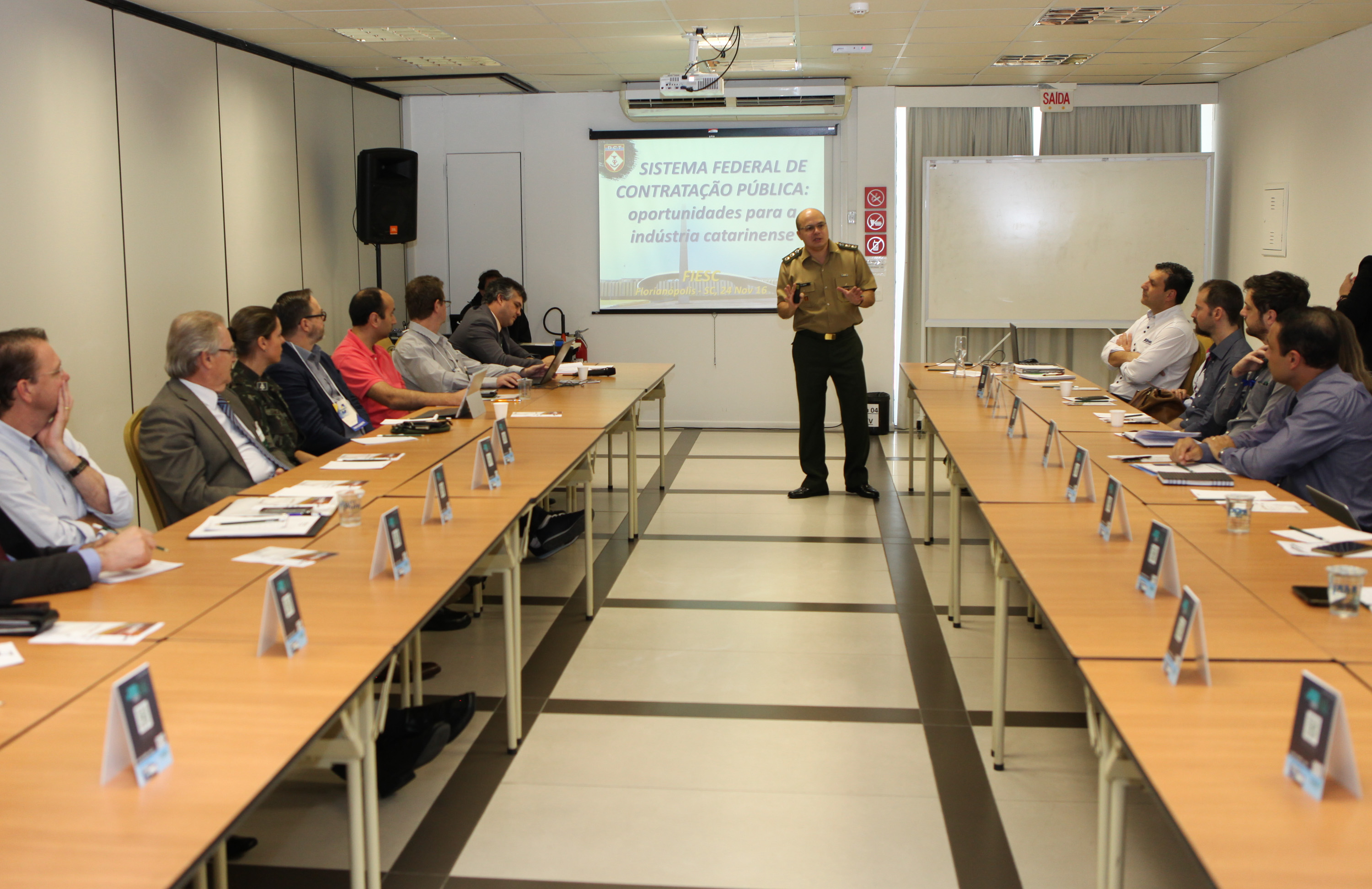 Florianópolis, 24.11.2016 – Representantes de indústrias catarinenses conheceram as demandas do Exército que podem ser atendidas por empresas o Estado. “A relação das Forças Armadas do ponto de vista da contratação de bens e serviços não é diferente da pública”, afirmou o tenente coronel André Luis Vieira, durante apresentação em reunião do Comitê da Indústria de Defesa da FIESC (Comdefesa), realizada nesta quinta-feira (24), em Florianópolis. Segundo ele, o Exército tem pelo menos R$ 2 bilhões em projetos contratados no médio e longo prazos, especialmente ligados às áreas de ciência e tecnologia.