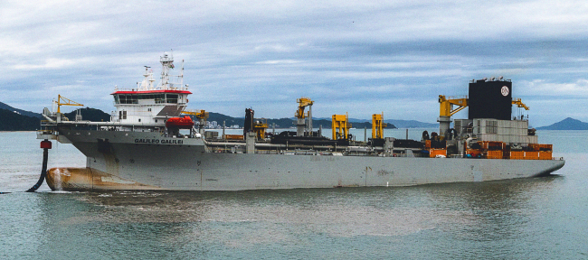 A draga Galileu Galilei é de propriedade da empresa Jan de Nul do Brasil e é uma das mais modernas do mundo: tem 166 metros de comprimento e capacidade de carregamento de 18 mil metros cúbicos, equivalente a 1.800 caminhões trucados. É o mesmo equipamento que realizou o engordamento da praia de Balneário Camboriú em 2021.