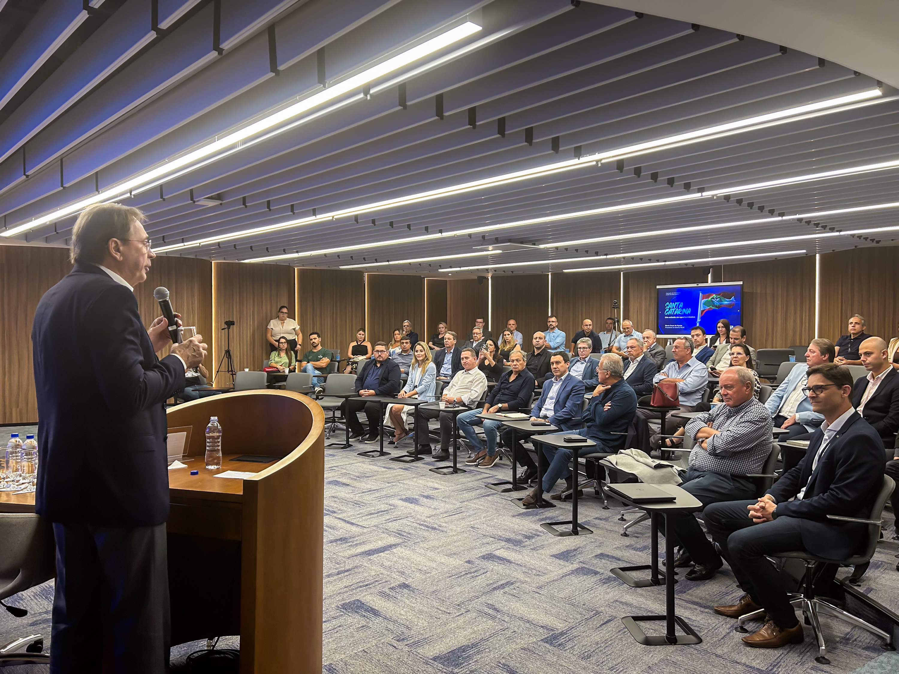 Florianópolis, 31.03.2025 – Lideranças empresariais e políticas de Palhoça participaram de um encontro na Federação das Indústrias (FIESC), na noite desta segunda-feira, dia 31. No evento, o presidente da FIESC, Mario Cezar de Aguiar, apresentou o potencial que SC tem para receber investimentos e destacou que Palhoça cresce acima da média catarinense - 6,1% ao ano desde 2002, enquanto o estado cresceu a uma taxa de 2,7% ao ano no período.