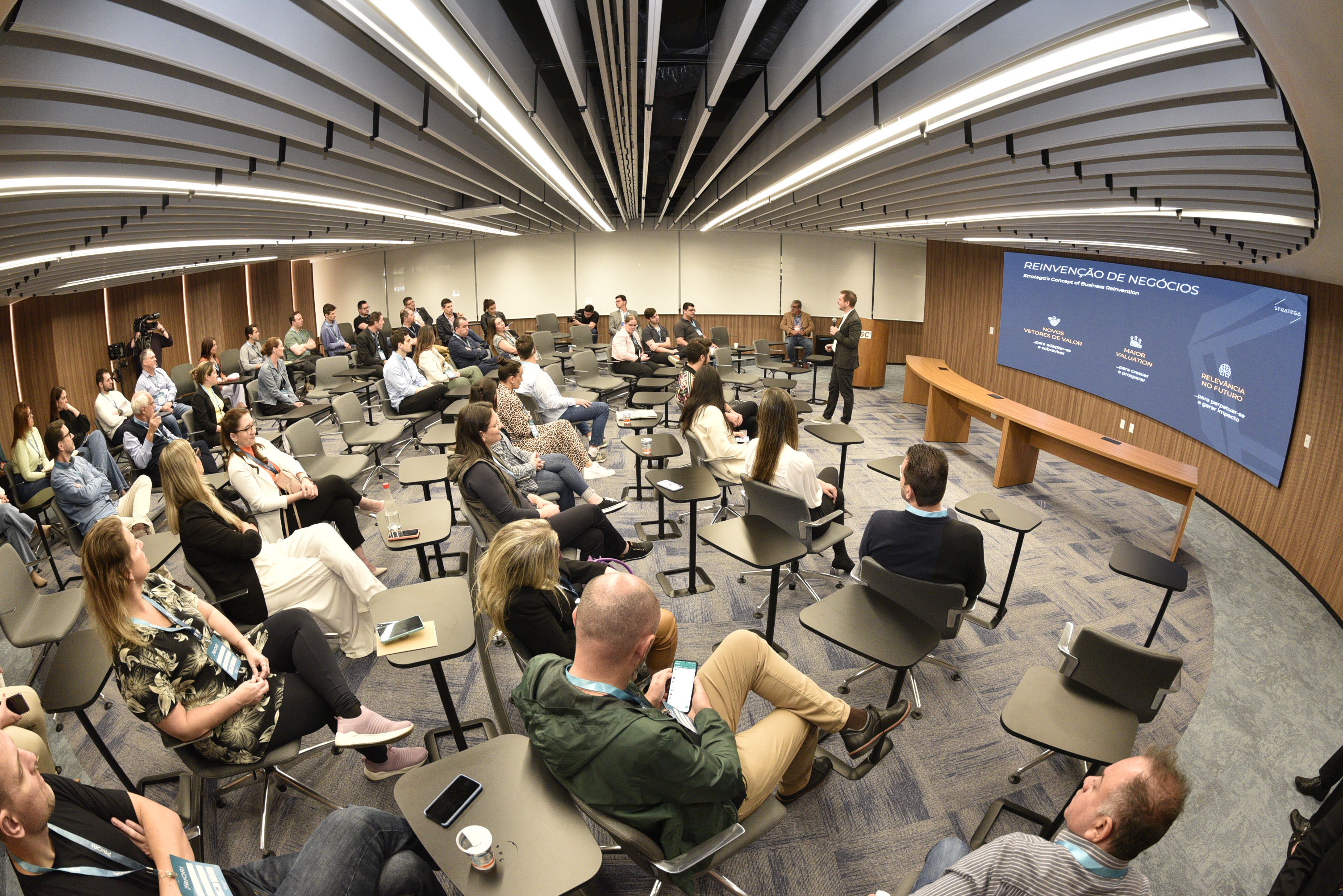 Tiago Grandi, consultor da Stratega, conduziu as atividades do dia que visam traçar o roadmap de reinvenção dos negócios. Além de definir a visão de futuro e de impacto, os participantes estabeleceram temas de negócios e fundação estratégica para avançar no roadmap. “A estratégia mora na interface, na relação com os investidores, na transação com clientes e a reinvenção deve ser constante. Hoje vamos nos dedicar a construir temas de negócios, como sementes das futuras estratégias”, explica Grandi. Ao final do dia, as empresas terão uma nova base para desenhar as estratégias para curto, médio e longo prazo. “Teremos um novo ponto de vista de como se desenvolver nos próximos anos”, acrescenta.
