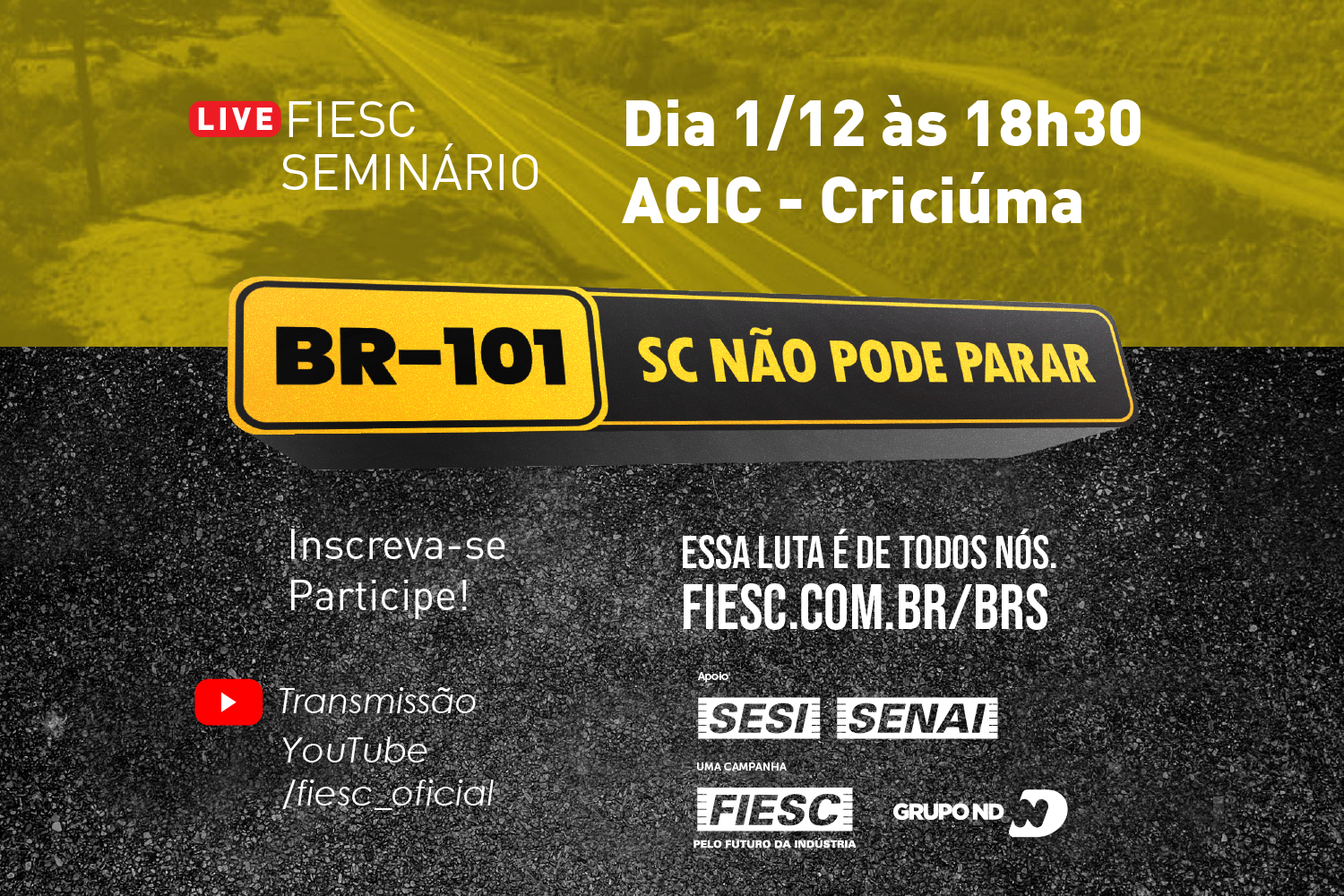 Nesta segunda-feira, dia 29, a FIESC e o Grupo ND lançaram o abaixo-assinado on-line para exigir investimentos nas rodovias federais do estado. Acesse www.sosbrs.com.br e saiba mais sobre a iniciativa que marca a nova fase da campanha “SC Não Pode Parar”.