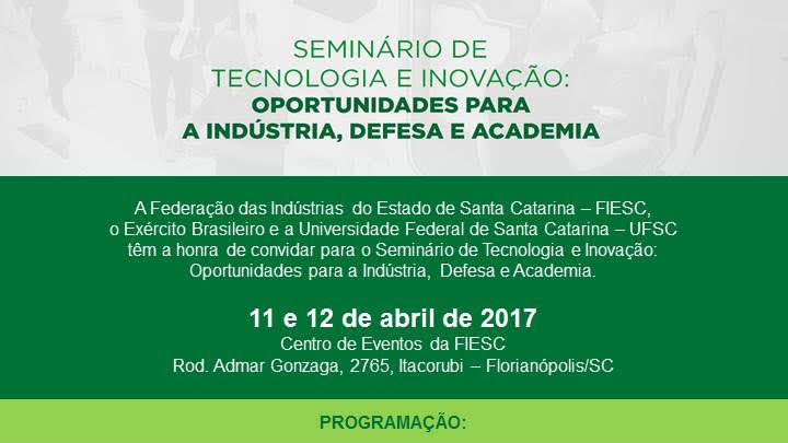 Florianópolis, 6.4.2017 – Nos dias 11 e 12 de abril será realizado o seminário “Tecnologia e inovação: oportunidades para a indústria, defesa e academia”, iniciativa promovida pela Federação das Indústrias de Santa Catarina (FIESC) em conjunto com a UFSC e o Exército Brasileiro. O evento será realizado na sede da FIESC, em Florianópolis. No dia 11 o encontro se inicia às 8 horas, com credenciamento; às 9 horas será realizada a abertura, com as presenças do presidente da FIESC, Glauco José Côrte, do reitor da UFSC, o professor Luiz Carlos Cancellier de Olivo, e do general Juarez Aparecido de Paula Cunha, chefe do departamento de ciência e tecnologia do Exército Brasileiro. Ao longo do dia serão realizados os painéis: “identificando oportunidades para a interação defesa-indústria-academia”; “fomentando a interação entre os atores envolvidos e óbices a serem superados”, “visão de futuro”, além de debates.