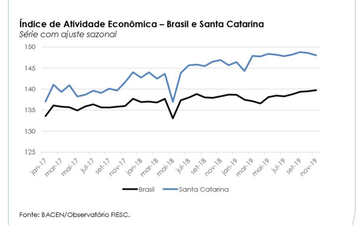 Florianópolis, 17.1.2020 – O Índice de Atividade Econômica Regional de Santa Catarina (IBCr-SC) acumula alta de 2,2% até novembro. O resultado é superior à média nacional que no período registrou crescimento de 0,9%, informam os dados do Banco Central, divulgados pelo Observatório FIESC. Entre as unidades da federação que possuem indicadores de atividade econômica, o desempenho catarinense no ano ficou na quarta posição, atrás do Amazonas, São Paulo e Goiás. O indicador é considerado uma prévia do PIB. Clique aqui e saiba mais