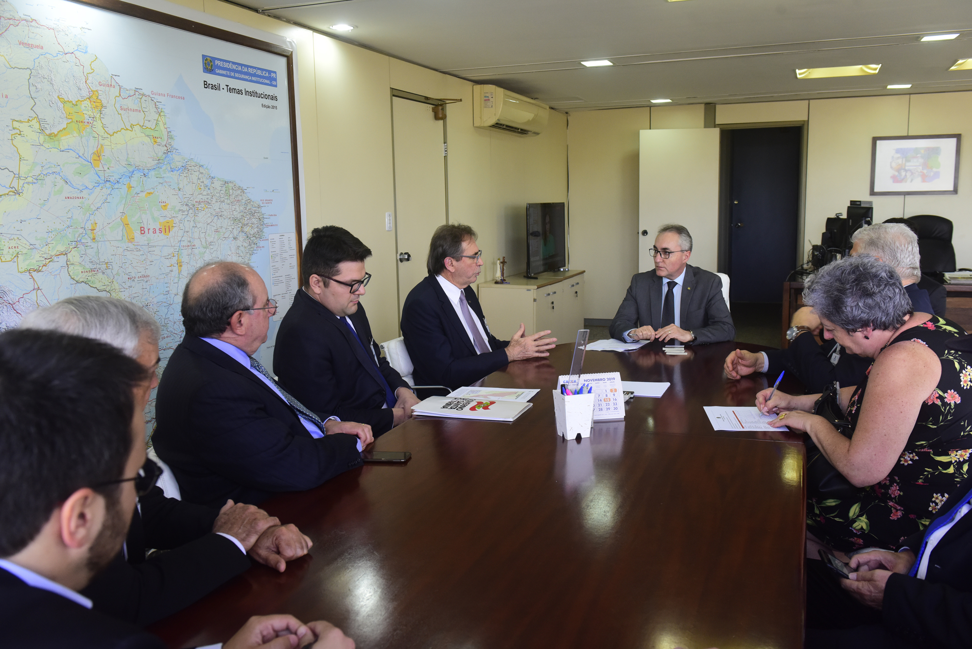 Florianópolis, 9.10.2019 – Em audiência com o secretário-executivo do Ministério da Justiça e Segurança Pública, Luiz Pontel de Souza, empresários de Santa Catarina defenderam solução conciliatória para a questão indígena do Morro dos Cavalos. O impasse se arrasta há anos e impede a conclusão do projeto da Ferrovia Litorânea e a conclusão das obras da BR-101 sul. Ao final do encontro, realizado nesta quarta-feira (9), na sede do Ministério, em Brasília, o grupo encontrou o ministro Sergio Moro que se comprometeu em também dar atenção ao assunto. Participaram os presidentes das entidades integrantes do Conselho das Federações Empresariais de Santa Catarina (COFEM), Mario Cezar de Aguiar (FIESC), Bruno Breithaupt (Fecomércio), José Zeferino Pedroso (Faesc), Ari Rabaiolli (Fetrancesc) e Alcides de Andrade Neto (Fampesc). Também participou da audiência o procurador do Estado, Alisson de Bom de Souza.