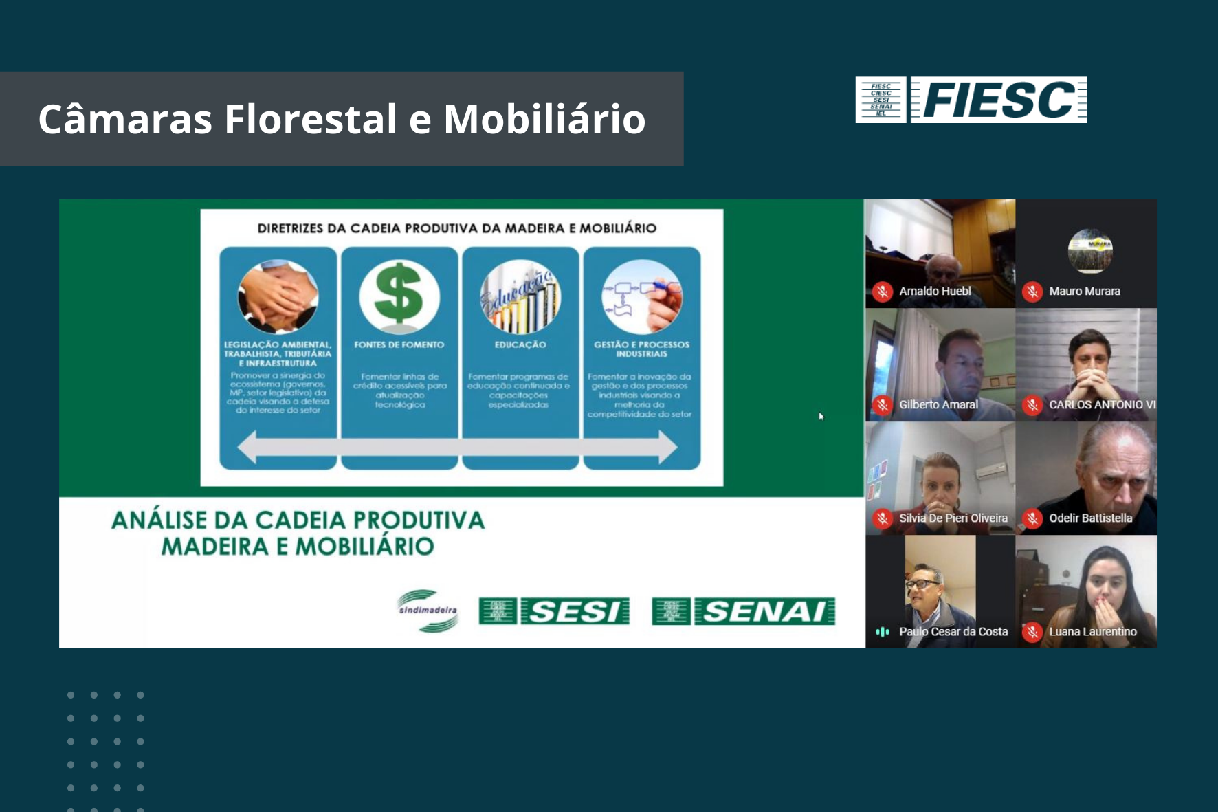 Florianópolis, 15.9.2020 – O Programa Travessia SC foi destaque em reunião virtual das Câmaras de Desenvolvimento da Indústria Florestal e do Mobiliário da FIESC, nesta terça-feira, dia 15. O programa é uma iniciativa da entidade para auxiliar Santa Catarina a vencer a crise provocada pela pandemia e atua em quatro frentes: reinvenção da indústria e da economia, investimento em infraestrutura, atração de capital e pacto institucional. Ainda no encontro, foram apresentadas as ações do Sindimadeira e do SENAI em prol do setor, foi debatido o mercado de madeira engenheirada (usada na construção civil) e a Associação Catarinense de Empresas Florestais (ACR) apresentou o Fundo Cooperativo de Melhoramento de Pinus (Funpinus).