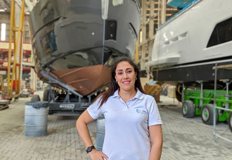Tapeçaria | Costureira com dez anos de experiência em tapeçarias, Carina é uma das responsáveis pela fabricação do estofamento usado nas embarcações. “Tudo é personalizado de acordo com o pedido de cada cliente. É um trabalho delicado, feito nos mínimos detalhes. Jamais imaginei que trabalharia em uma empresa que fabrica iates, e quando cheguei fiquei impressionada e encantada com o ambiente de trabalho”, lembra Carina, que é natural de Córdoba, segunda maior cidade da Argentina.