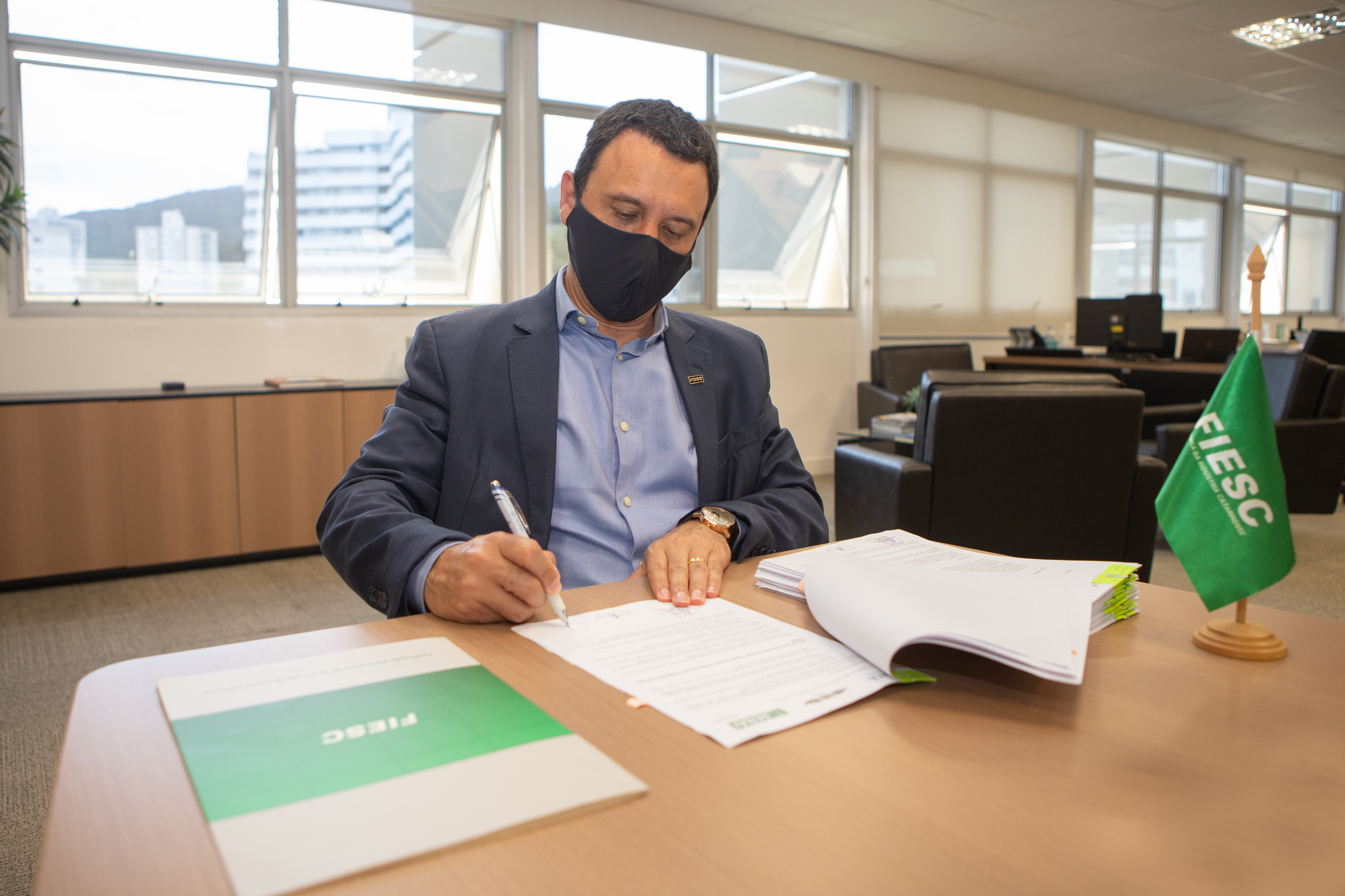 Florianópolis, 9.3.2021 - O SENAI, entidade da FIESC, dá início em maio à formação de profissionais do Paraguai na área de manutenção de aeronaves. A iniciativa é resultado de uma parceria triangular firmada pela instituição com a Direção Nacional de Aeronáutica Civil (DINAC), do Paraguai, e a Agência Internacional de Cooperação da Coreia (KOICA). No Brasil, o memorando de entendimentos foi assinado na quinta-feira (4) pelo diretor de educação e tecnologia da FIESC e diretor regional do SENAI/SC, Fabrizio Machado Pereira.