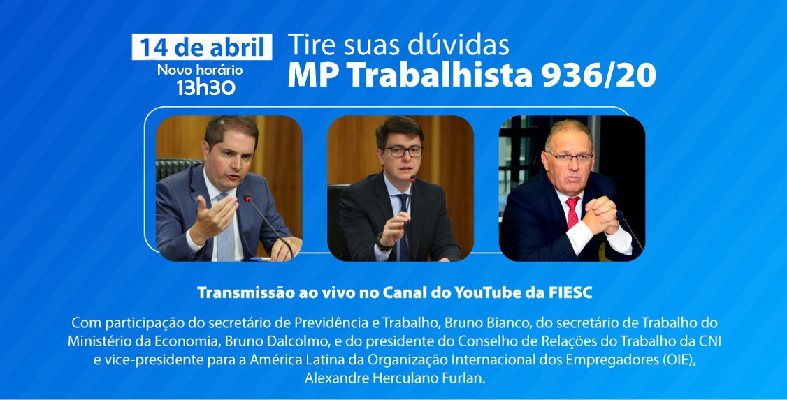 Florianópolis, 14.4.2020 – Em transmissão ao vivo pelo YouTube da FIESC, nesta terça-feira, dia 14 de abril, representantes de indústrias de Santa Catarina tiveram a oportunidade de tirar dúvidas sobre os principais pontos da MP 936/20, que instituiu o Programa Emergencial de Manutenção de Emprego e Renda. Participaram do encontro o secretário de Trabalho do Ministério da Economia, Bruno Dalcolmo, o presidente do Conselho de Relações do Trabalho da CNI e vice-presidente para a América Latina da Organização Internacional dos Empregadores (OIE), Alexandre Herculano Furlan, além do presidente da FIESC, Mario Cezar de Aguiar, e do diretor institucional e jurídico, Carlos José Kurtz. CLIQUE AQUI PARA ASSISTIR À TRANSMISSÃO