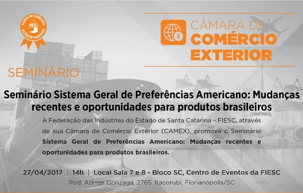 Florianópolis, 18.4.2017 – A Câmara de Comércio Exterior da Federação das Indústrias de Santa Catarina (FIESC) realiza o seminário “Sistema Geral de Preferências Americano: mudanças recentes e oportunidades para produtos brasileiros”, no dia 27 de abril, das 13h30 às 16h, na sede da entidade, em Florianópolis. O encontro terá palestras de representantes do Ministério das Relações Exteriores (MRE) e da Confederação Nacional da Indústria (CNI).