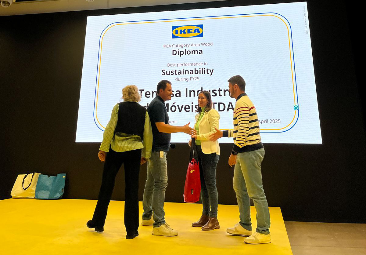 Florianópolis, 15.04.2025 - A Temasa, indústria de móveis sediada em Caçador, recebeu no sábado (12), em Älmhult, na Suécia, um prêmio por ações de sustentabilidade. O reconhecimento foi concedido pela IKEA, multinacional varejista do ramo de móveis.
