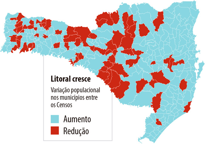 Os números do Censo mostram claramente a tendência de crescimento populacional e da economia catarinense no litoral, principalmente entre a Grande Florianópolis e o Nordeste do Estado. Se, no mapa, os municípios que cresceram forem pintados de azul e os que perderam população forem preenchidos em vermelho (veja nesta página), toda a faixa litorânea é azul – a exceção é Laguna, no Sul, que teve decréscimo populacional devido à emancipação do município de Pescaria Brava. Já a faixa correspondente ao Planalto Serrano e ao Planalto Norte é quase toda pintada de vermelho – a exceção fica para as maiores cidades, Lages, Curitibanos e Canoinhas, que tiveram crescimentos populacionais modestos, na faixa de 5%. Tudo somado, parece clara a tendência de estagnação na região. No Oeste, por outro lado, ainda que se apresentem muitas ilhas vermelhas, as principais cidades tiveram crescimento vigoroso, em grande parte pela força da indústria, conforme se demonstra na matéria subsequente.