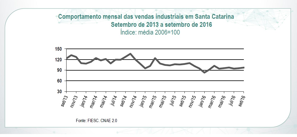 No acumulado de nove meses, entre as atividades que mais diminuíram as vendas estiveram alimentos (11,3%), móveis (24%), produtos de metal (28,4%), metalurgia (13,2%), confecções, artigos do vestuário e acessórios (11,8%), produtos de madeira (9,6%), produtos têxteis (8,4%) e equipamentos de informática, eletrônicos e óticos (14%). Bebidas foi o único setor que cresceu no período (3,2%).